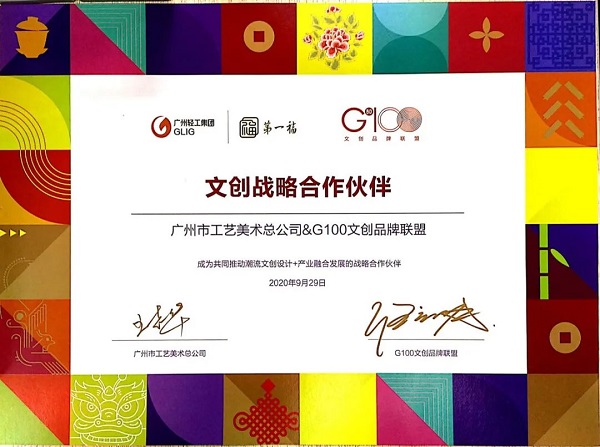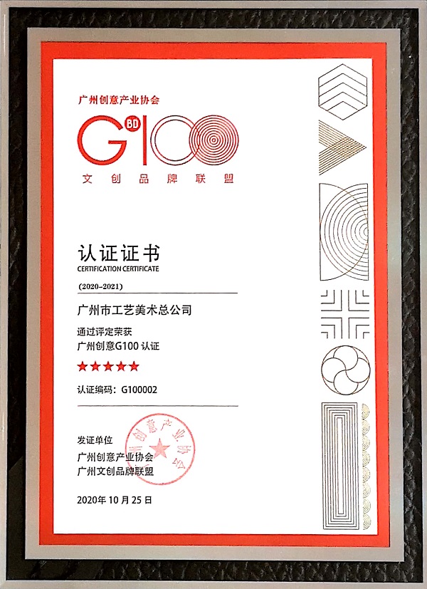 “G100創(chuàng)意100聯(lián)合品牌”是廣州創(chuàng)意產(chǎn)業(yè)協(xié)會、廣州文創(chuàng)品牌聯(lián)盟與GBDO組委會發(fā)起的聯(lián)盟認(rèn)證,在廣州市文化體制改革與文化產(chǎn)業(yè)發(fā)展辦公室指導(dǎo)支持下建立,從創(chuàng)作與提升廣州城市品牌形象的指導(dǎo)思想出發(fā),與各文創(chuàng)行業(yè)、企業(yè)一起產(chǎn)融共建。本次通過認(rèn)證,是相關(guān)機(jī)構(gòu)對廣州市工藝美術(shù)總公司致力于文創(chuàng)產(chǎn)品設(shè)計研發(fā)、活化非遺、廣州IP文旅點(diǎn)合作開發(fā)的認(rèn)可。