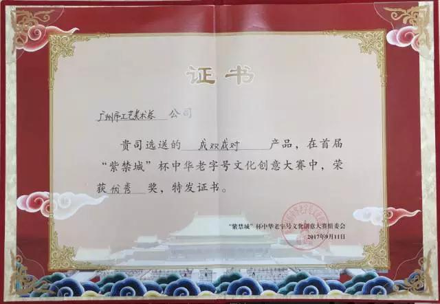 廣州市工藝美術總公司選送的廣繡作品《成雙成對》,榮獲首屆“紫禁城”杯中華老字號文化創(chuàng)意大賽優(yōu)秀獎。