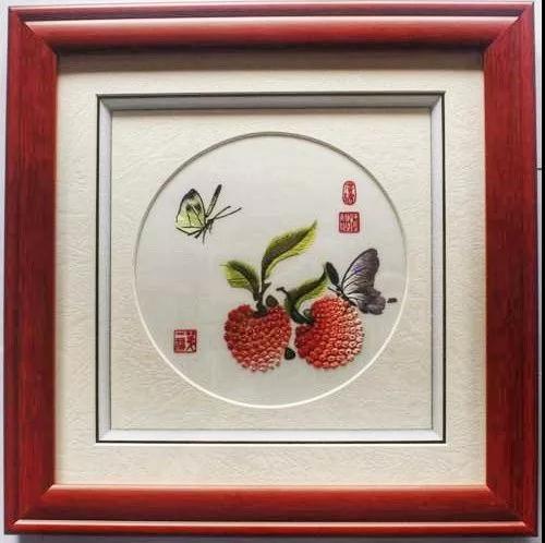 獲評作品運用細膩入微的廣繡繡法,以嶺南佳果荔枝為題材,果實形美色艷、形態(tài)飽滿,又伴有彩