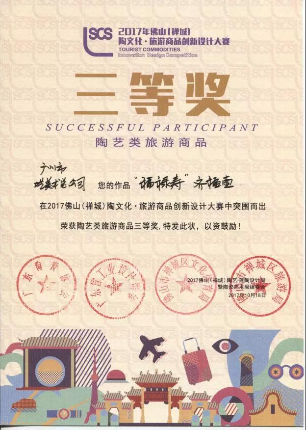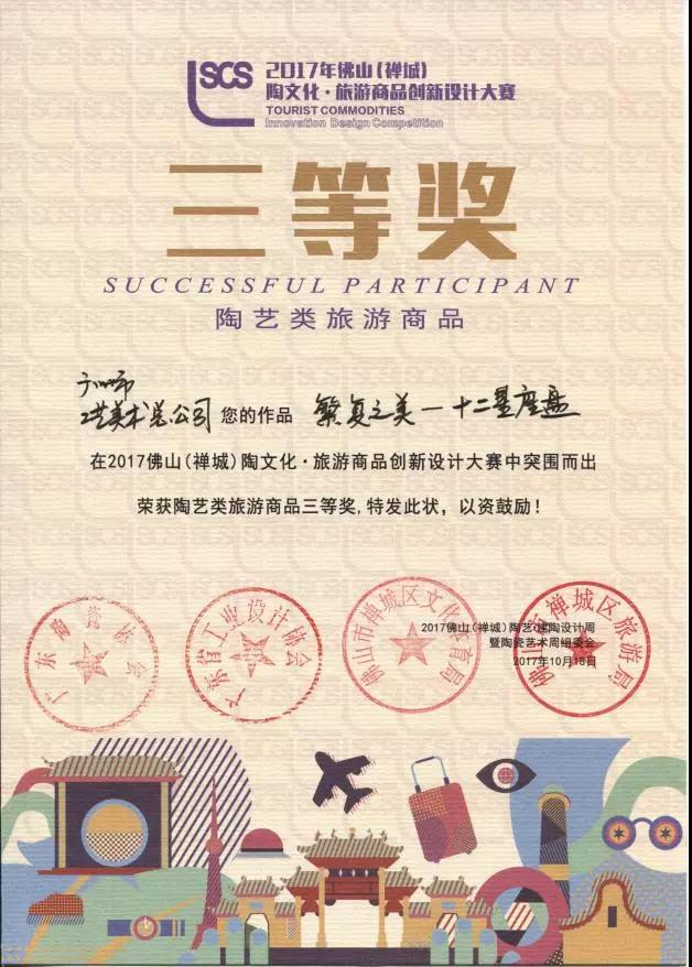 10月19日,第一福自主品牌的陶藝作品《福祿壽齊福壺》、《繁復之美-十二星座盤》榮獲由廣東省工業(yè)設計協(xié)會和廣東省陶瓷行業(yè)協(xié)會指導舉辦的 2017年佛山(禪城)陶文化·旅游商品創(chuàng)新設計大賽”三等獎。