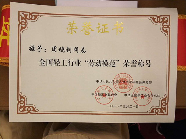 2018年4月19日,周鏡釗同志參加了廣東省輕工業(yè)聯(lián)合會召開的表彰大會,并被授予全國輕工行業(yè)“勞動模范”榮譽稱號。